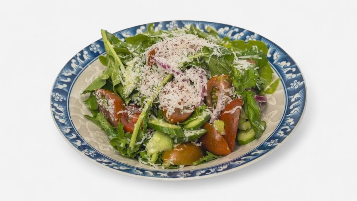 גרגר, מלפפון, עגבניות שרי, בצל סגול, תפוח ירוק, שמן זית, לימון סילאן, אגוזים, גבינת משק מגורדת