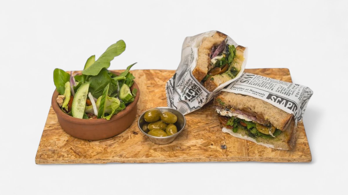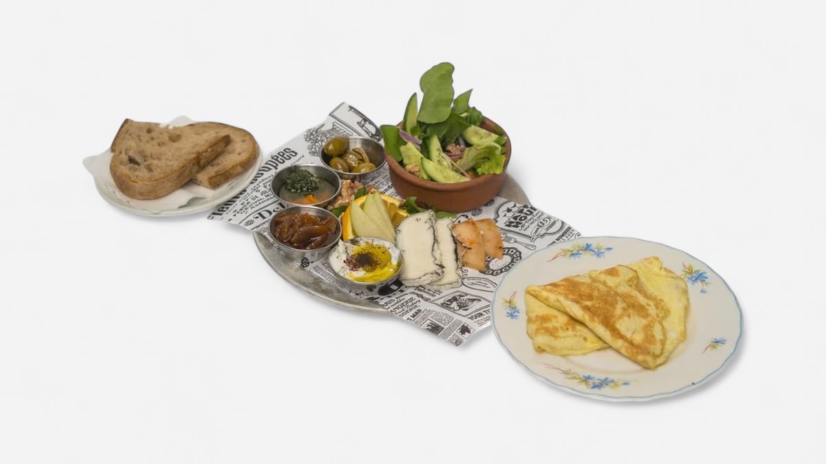 גבינה משק רכה, גבינה קשה, ריבה, פסטו כוסברה, תפוח ירוק, בצל סגול, עגבניות שרי מיובשות, מלפפון לחם מחמצת ובשישי יוצא עם חלה