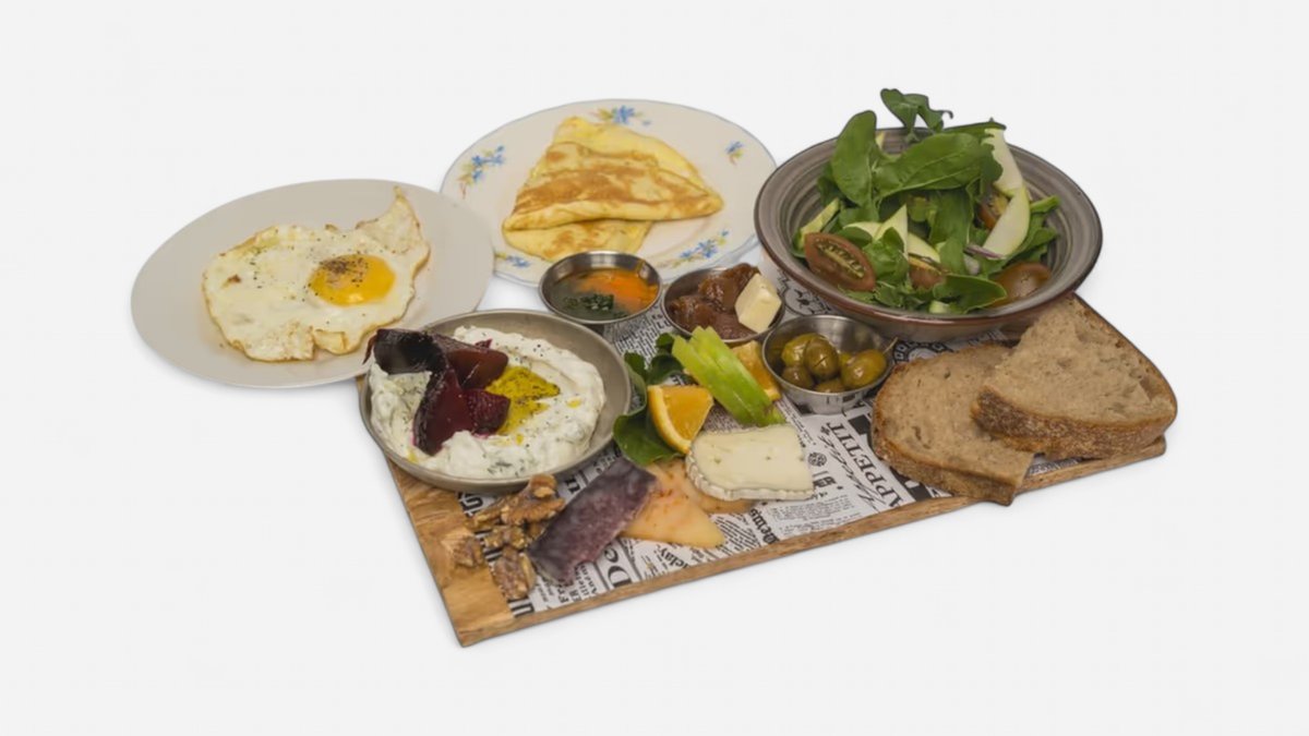 ביצים לבחירה, סלט עלים, 2-3 סוגים של גבינות משק תוצרת הארץ (כ-65 גרם), מגוון מטבלים שלנו ולחם מחמצת