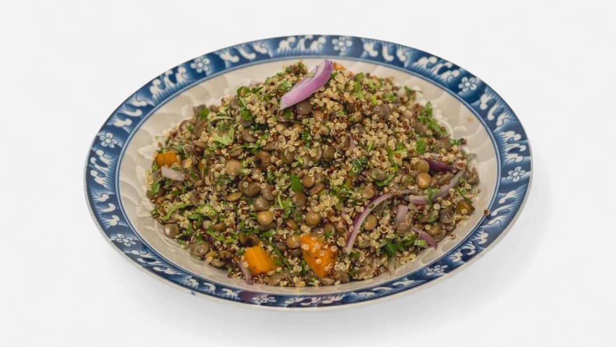 עדשים ירוקות, גרגירי חומוס מבושל, בצל, גזר, סלרי, לימון, כוסברה ופטרוזיליה