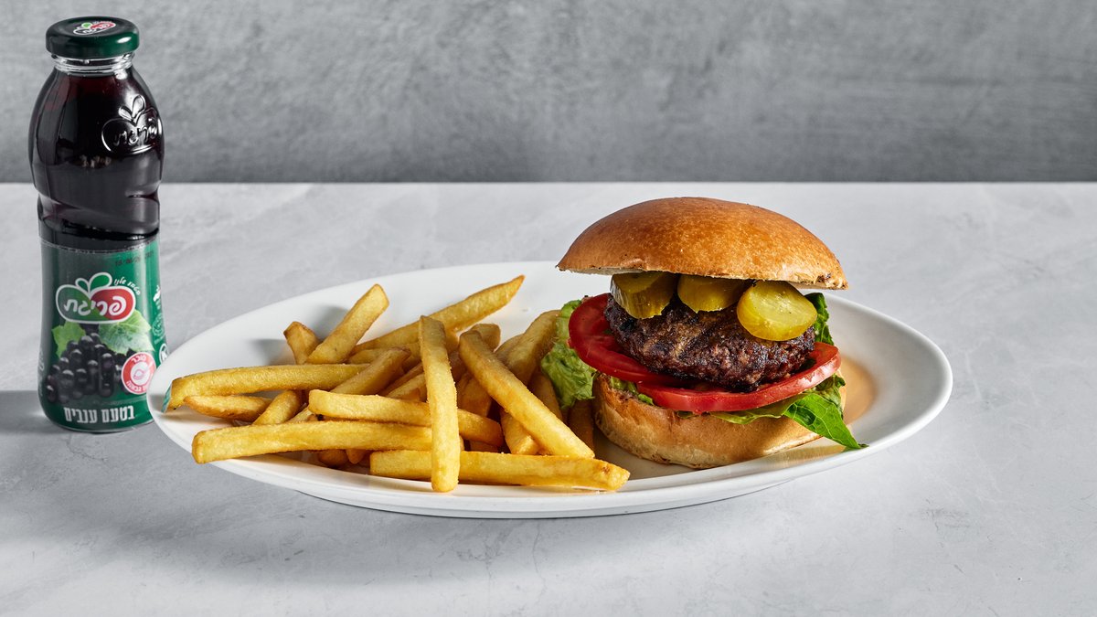 ביפבורגר 250 גר׳, חסה, עגבניה, בצל, מלפפון חמוץ ותוספת לבחירה