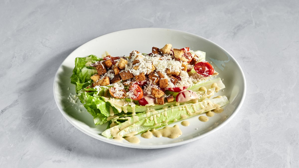 חסה, עגבניות שרי, קרוטונים וגבינת פרמזן. רוטב קיסר בצד