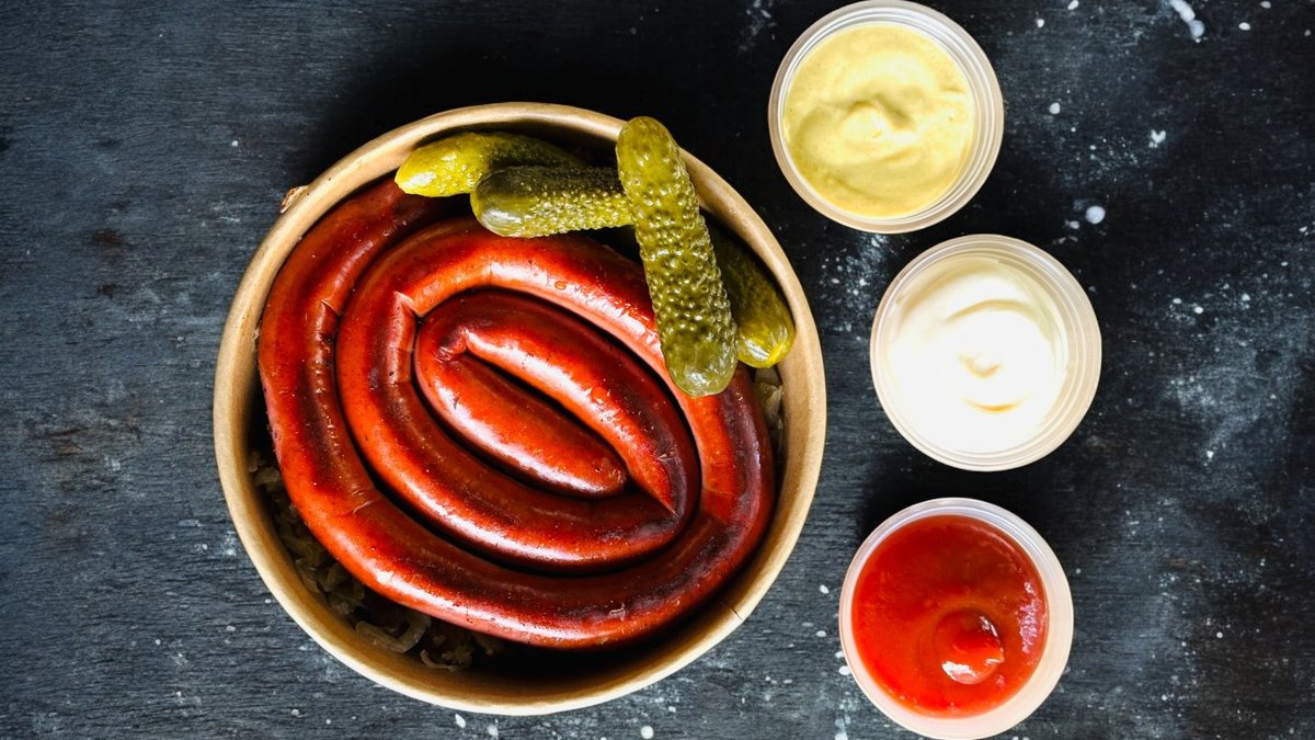 נקניקיית ספירלה פולנית 200 גרם עשויה בשר לבן ומעושנת בעץ, מוגשת על כרוב ובצל מטוגן בתוספת רטבים וקורנישונים.