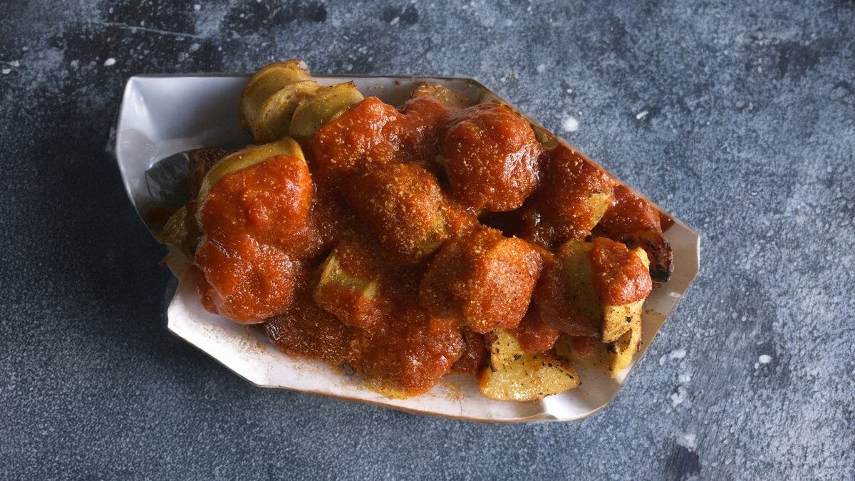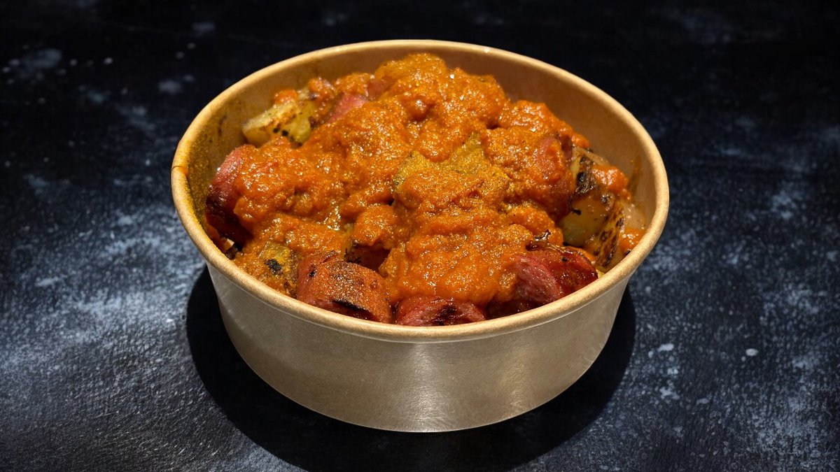 המנה הקלאסית מגרמניה עם נקניקיית עגל ספרדית ענקית חתוכה, מלווה בתפוחי אדמה אפויים ועטופה ברוטב עגבניות קארי חם שאנחנו מכינים במקום. מומלץ לקחת עם בצל מטוגן.