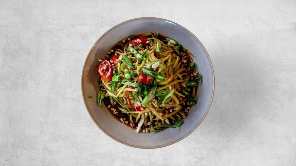 שיערות פפאיה, עגבניות שרי, קולורבי, שעועית תאילנדי, בצל ירוק ובוטנים גרוסים ברוטב תאילנדי | חריף