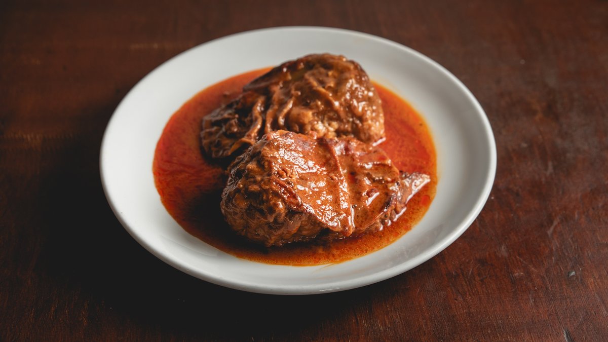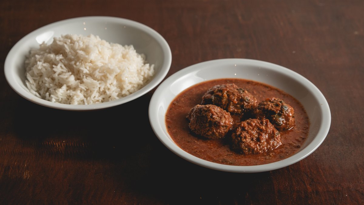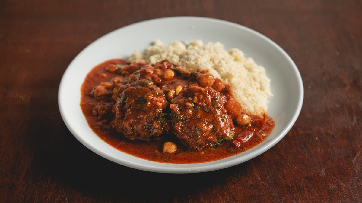 מבושלות ברוטב עגבניות וכרפס, מוגשות על מצע של אורז