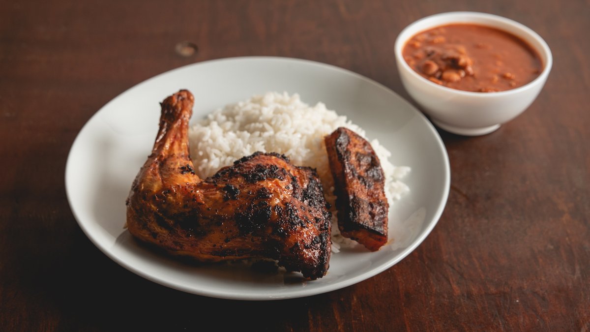 עוף בגריל בפפריקה ושום עם תפוחי אדמה ותוספת ורוטב לבחירה