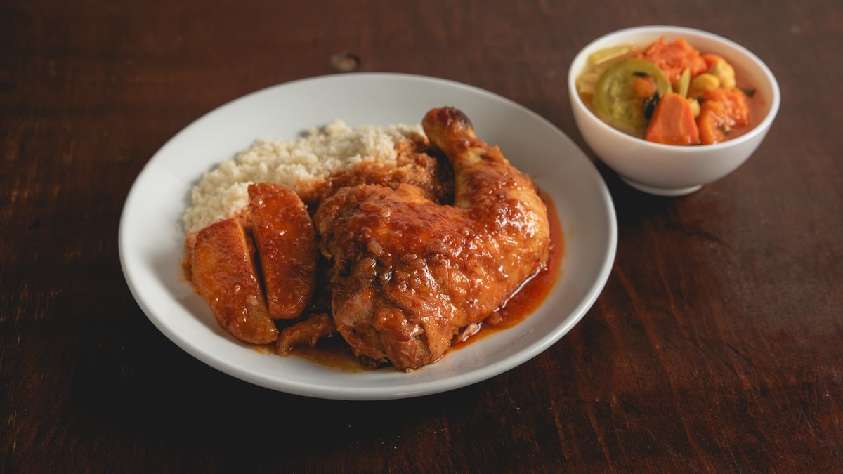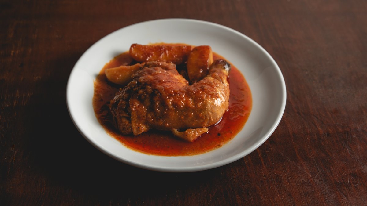 כרע עוף ותפו״א בציר עגבניות בבישול ארוך, עם תוספת ורוטב לבחירה