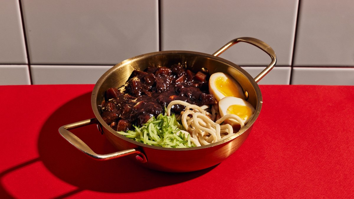 תבשיל קוריאני עשיר של אטריות אודון ברוטב שעועית שחורה עם פרגית, גזר, תפוחי אדמה ובצל לבן, מוגש עם מלפפון טרי וביצה רכה בסויה
