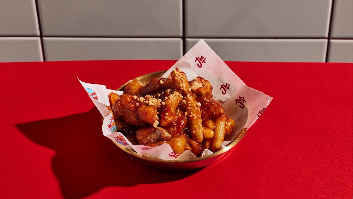 מעטפת אטריות קריספיות, במילוי חצי גבינת מוצרלה וחצי נקניקיית חזיר, גאודה וטימין. מוגש עם פסי איולי גוג'וג'אנג ורוטב הוט גוצ'וג'אנג מעל
