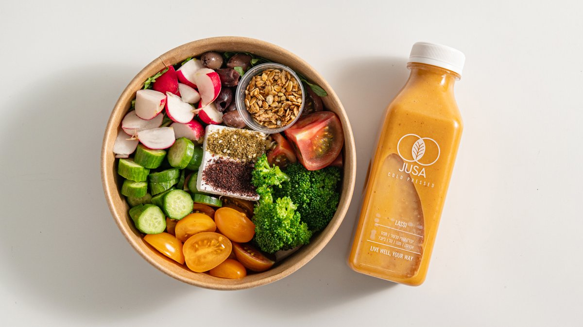 מלפפון, עגבניות שרי, עגבניות מגי, צנונית, ברוקולי, זיתי קלמטה, רוקט, גרנולה מלוחה, גבינת פטה טבעונית