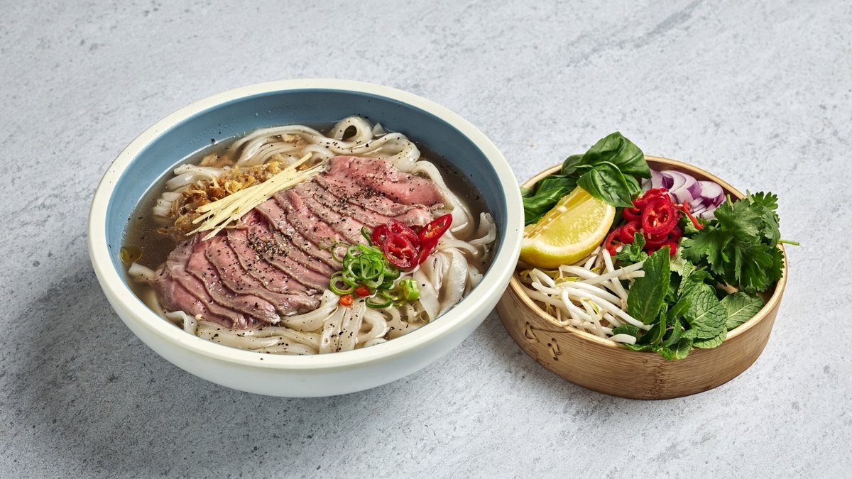 מרק ויאטנמי מסורתי וארומטי עם ירקות טריים בצד (נבטים, בזיל צאי, כוסברה, נענ, בצל סגול, בצל ירוק, צ'ילי ולימון)