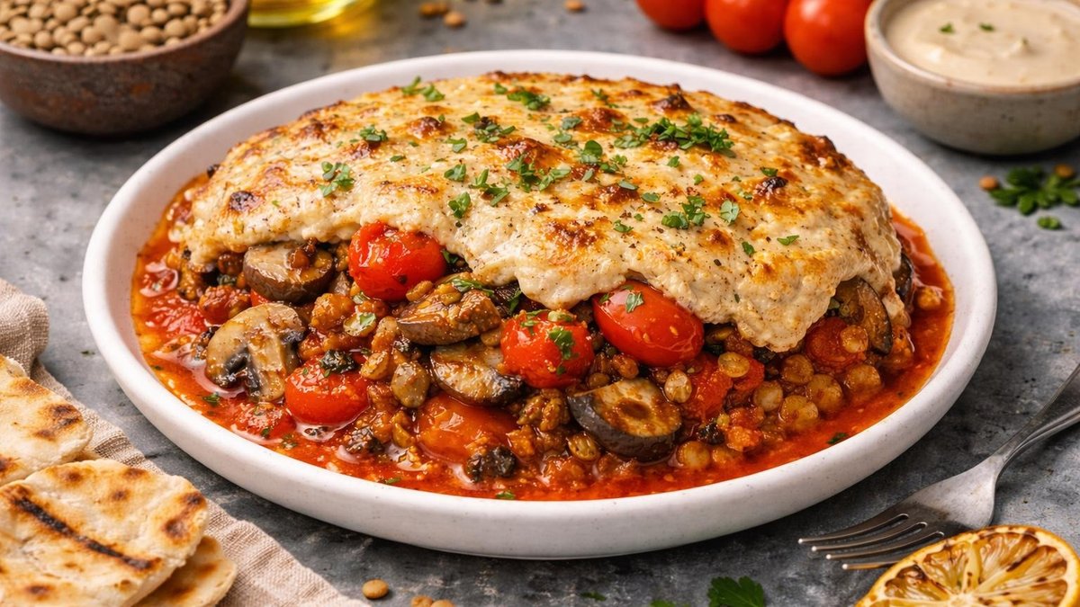 שכבות של עגבניות שרי, פטריות ועדשים במעטפת טחינה, אפויים בתנור - מומלץ!!!