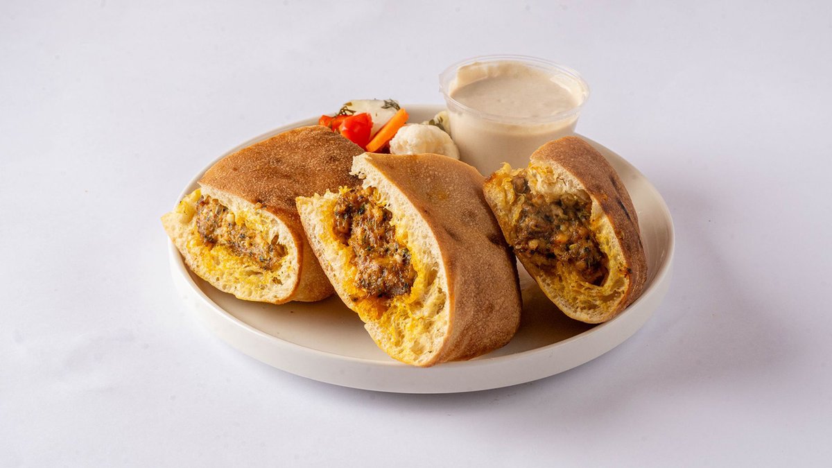 3 יח׳ קבב עוף ומתובל בפרנה קראנצ׳ית מוגש עם חמוצי הבית וטחינה לבנה