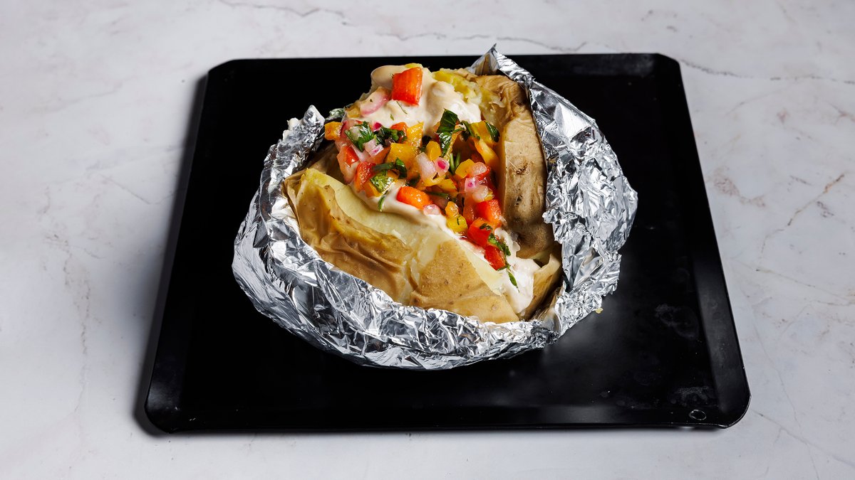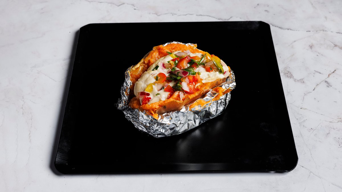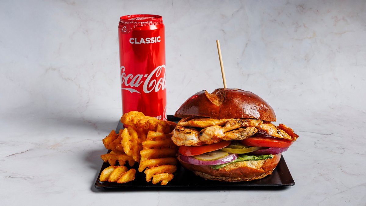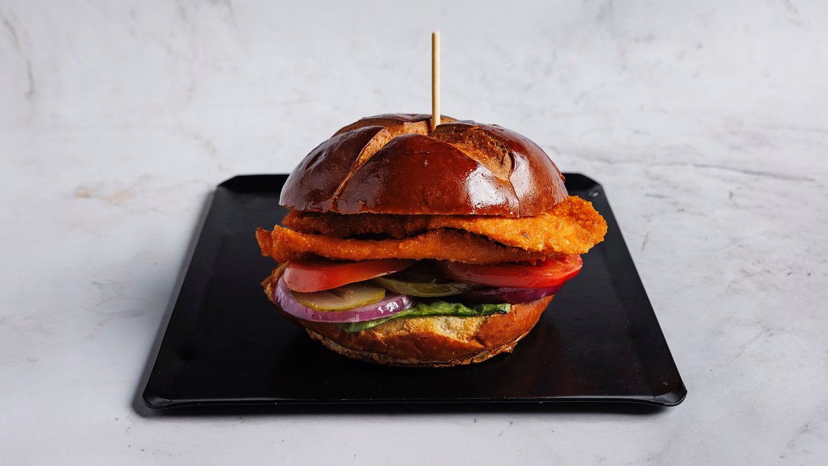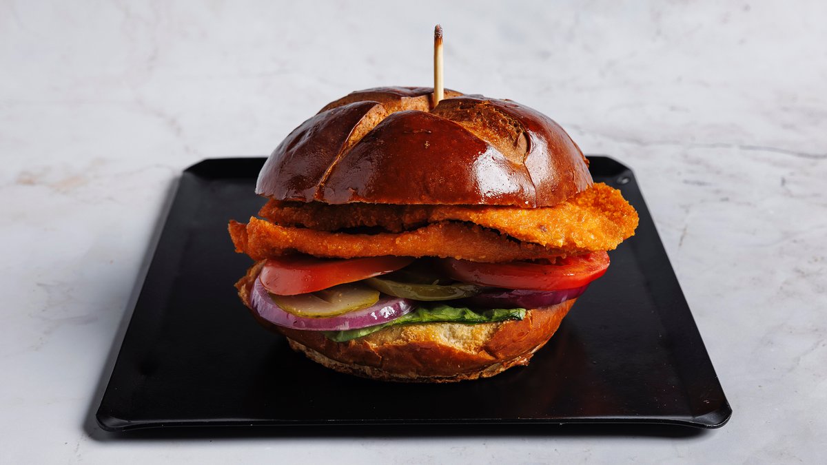 שניצל קריספי עם חסה, מלפפון חמוץ, עגבניה ובצל סגול