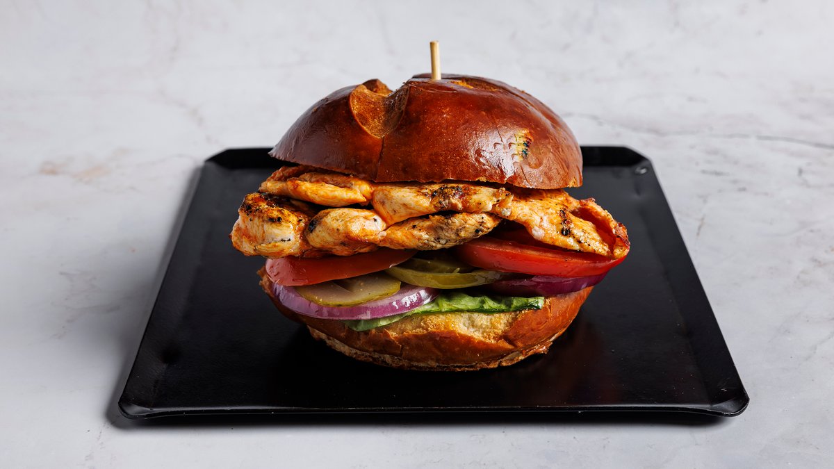 חזה עוף עם חסה, מלפפון חמוץ, עגבניה ובצל סגול