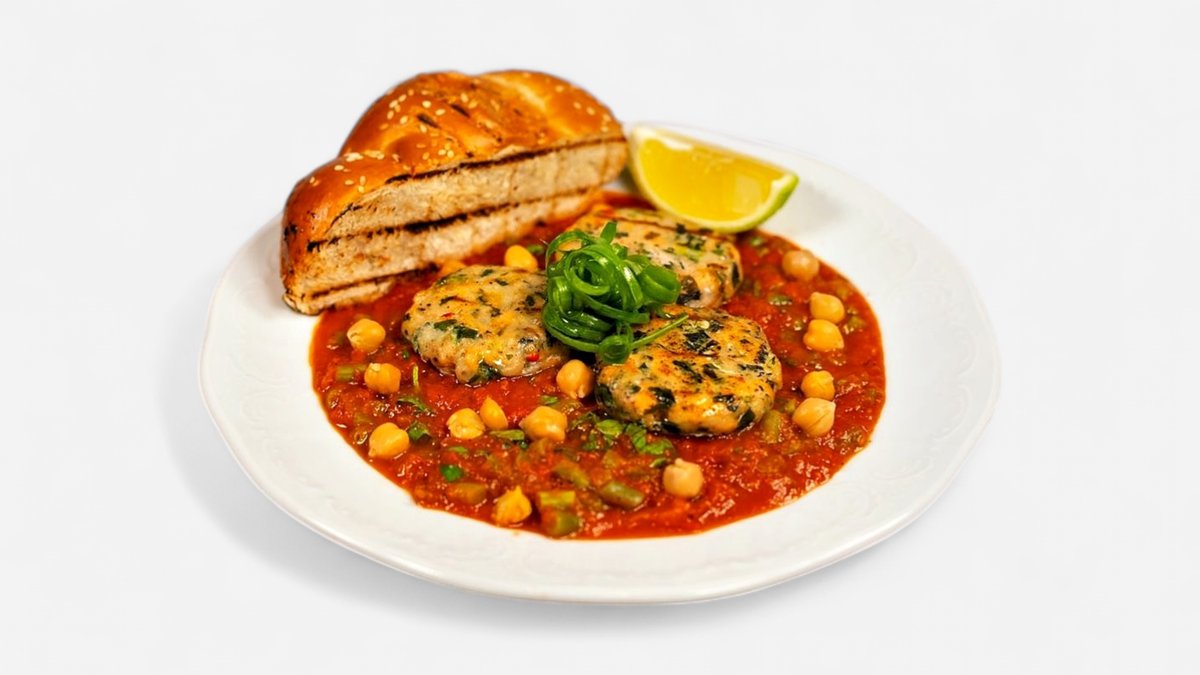 כוסברה, פטרוזיליה, צ'ילי ובצל ירוק על רוטב עגבניות, גרגירי חומוס, פרוסת חלה