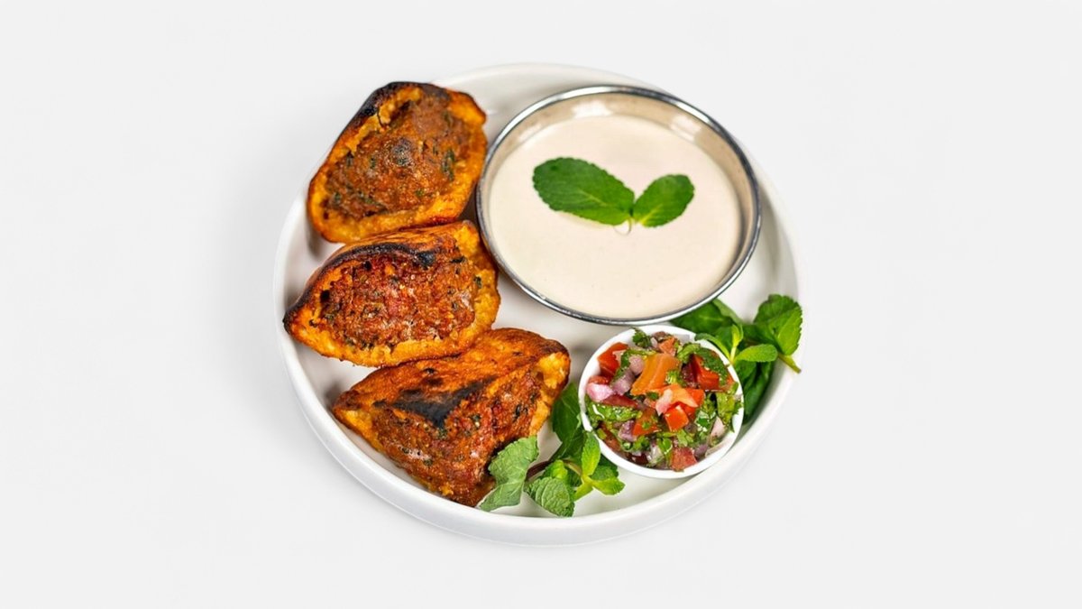 רבעי פיתה במילוי בשר בקר, אגוז מלך ופיסטוק, פפריקה, עגבניות וכמון, מוגשים עם טחינה וסלסה