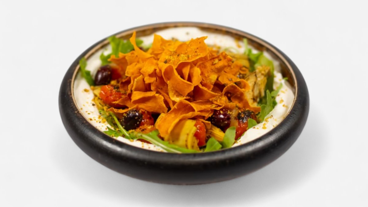 חם וקר, עגבניות ובצלים צלויים, זיתים, ארוגולה, פיסטוק, צ׳יפס בטטה