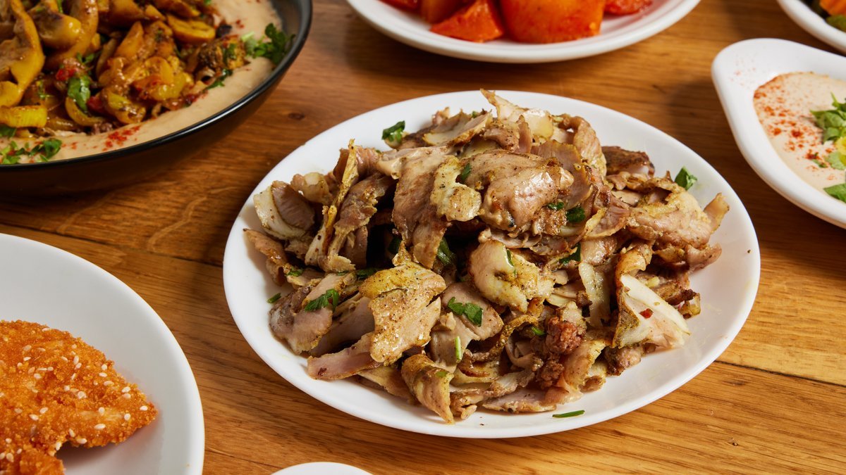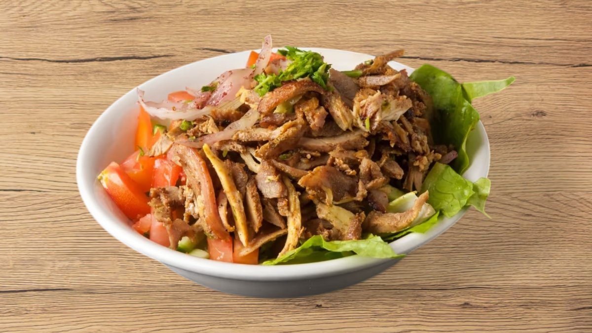מוגש עם אורז, תפוח אדמה, סלט ירקות עגבניה, מלפפון ובצל) וסלטים לבחירה