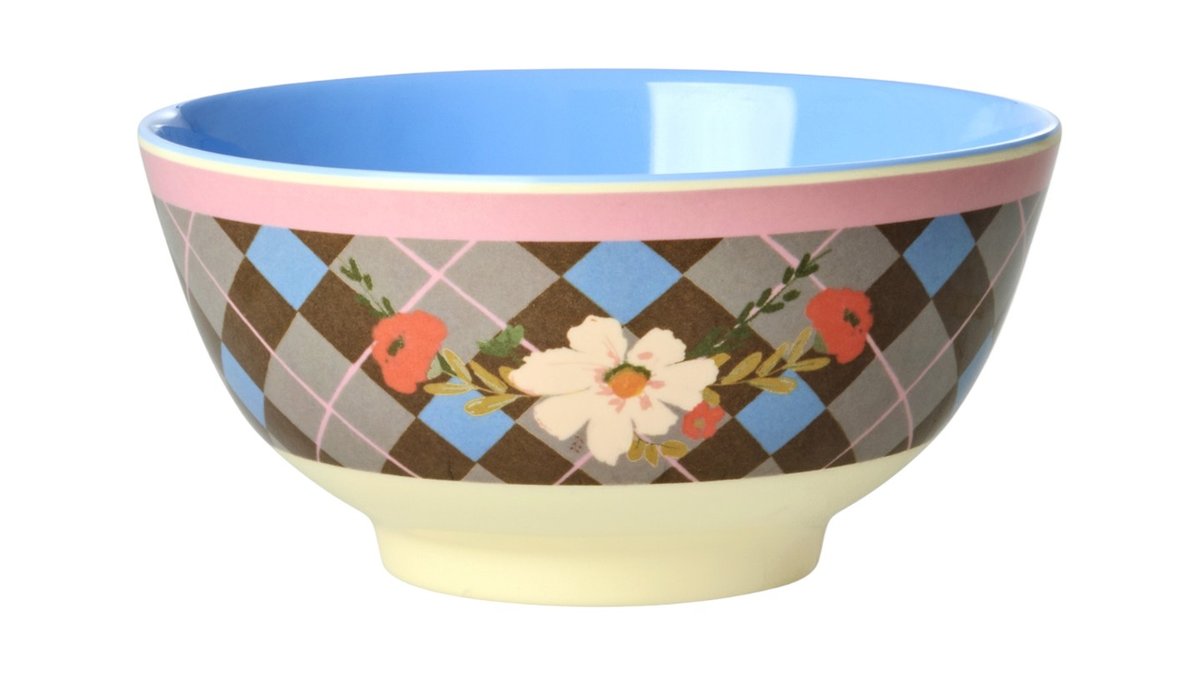קערית מלמין פרחים במשבצות רקע ורוד רך