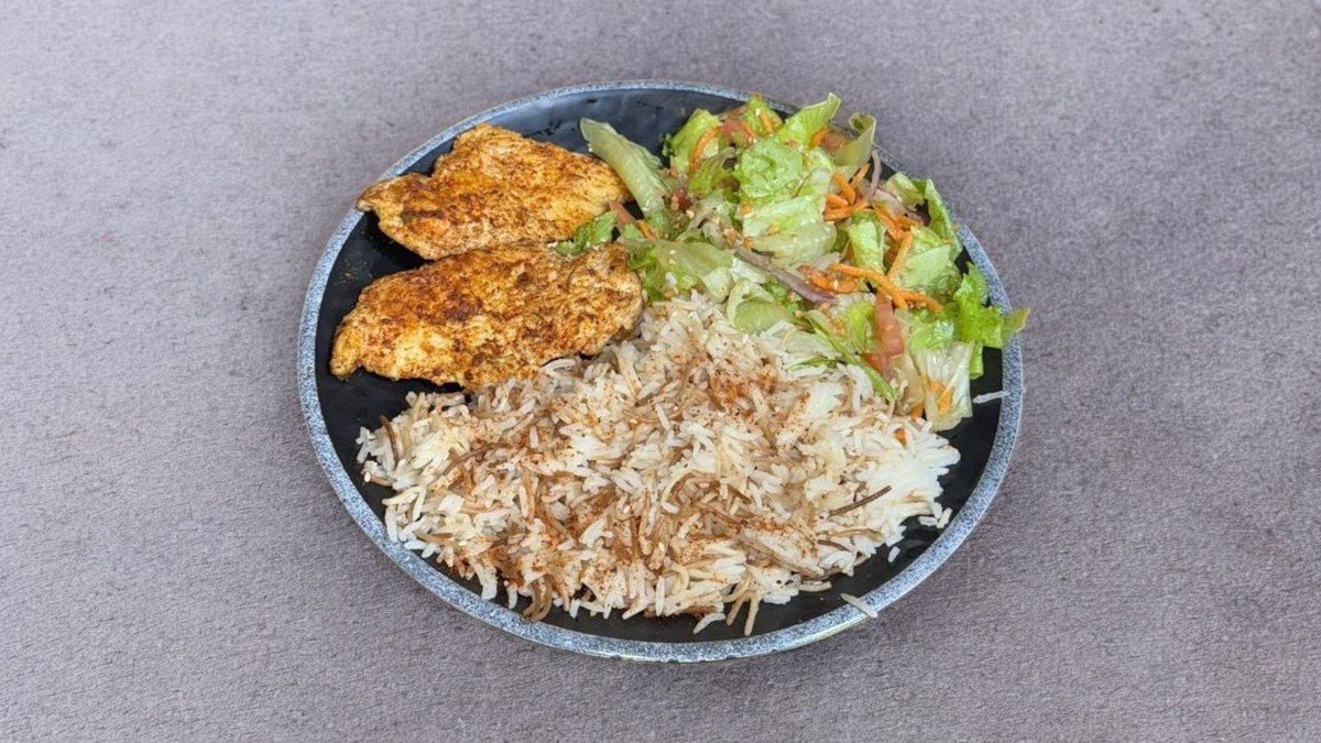 פרגית, חסה, עגבניות שרי, פטריות שמפיניון מוקפצות, גזר, בוטנים מסוכרים, בטטה קריספית וחמוציות מוגש עם לחם לבחירה