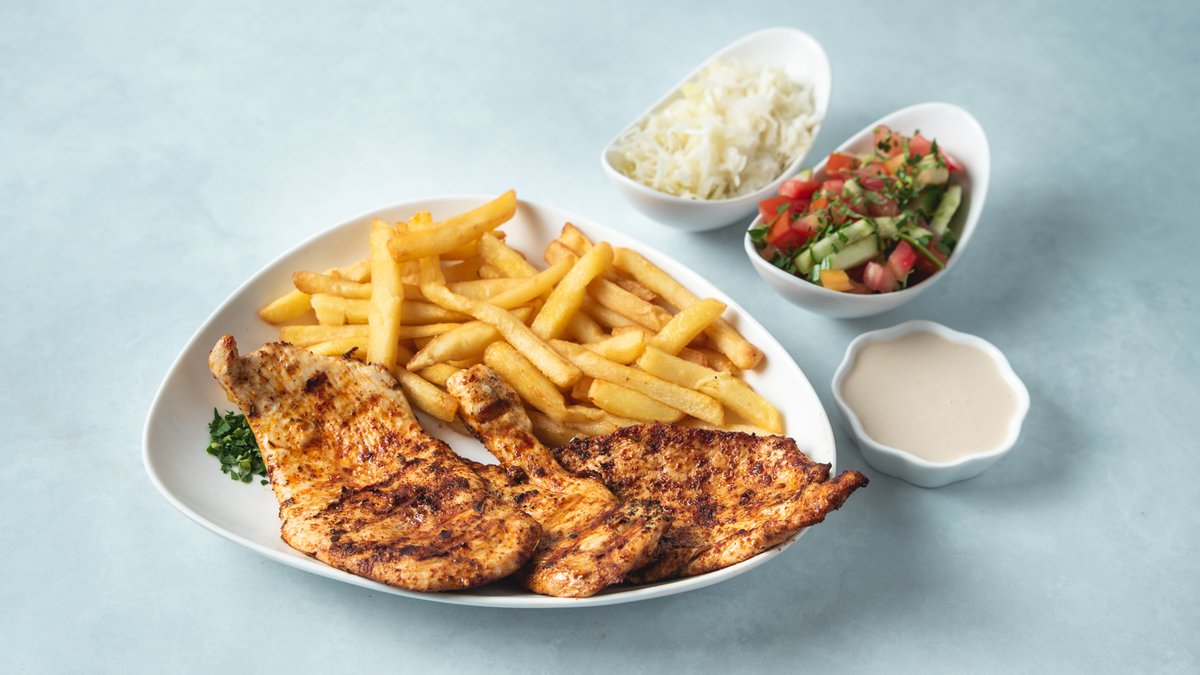 חזה עוף עם חסה, מלפפון, עגבניה, בצל, פטרוזיליה ורטבים לבחירה