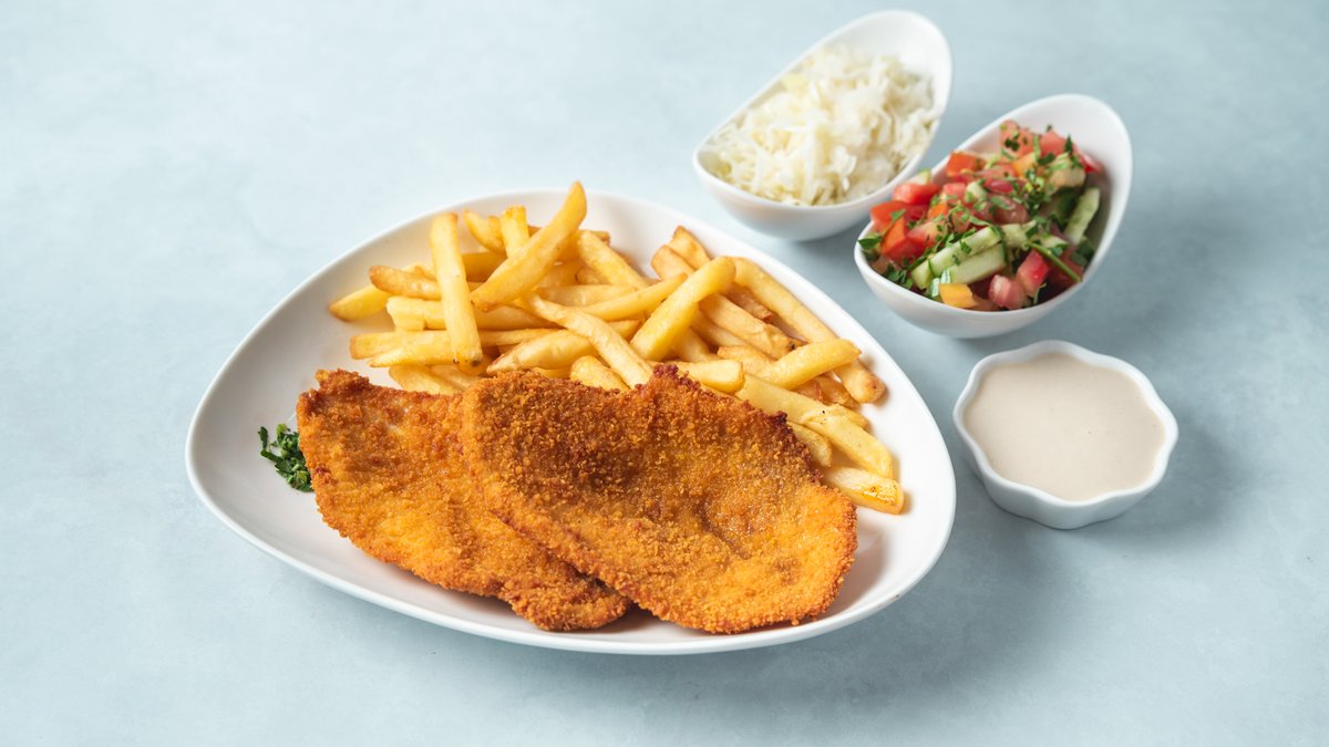 שניצל עם חסה, מלפפון, עגבניה, בצל, פטרוזיליה ורטבים לבחירה