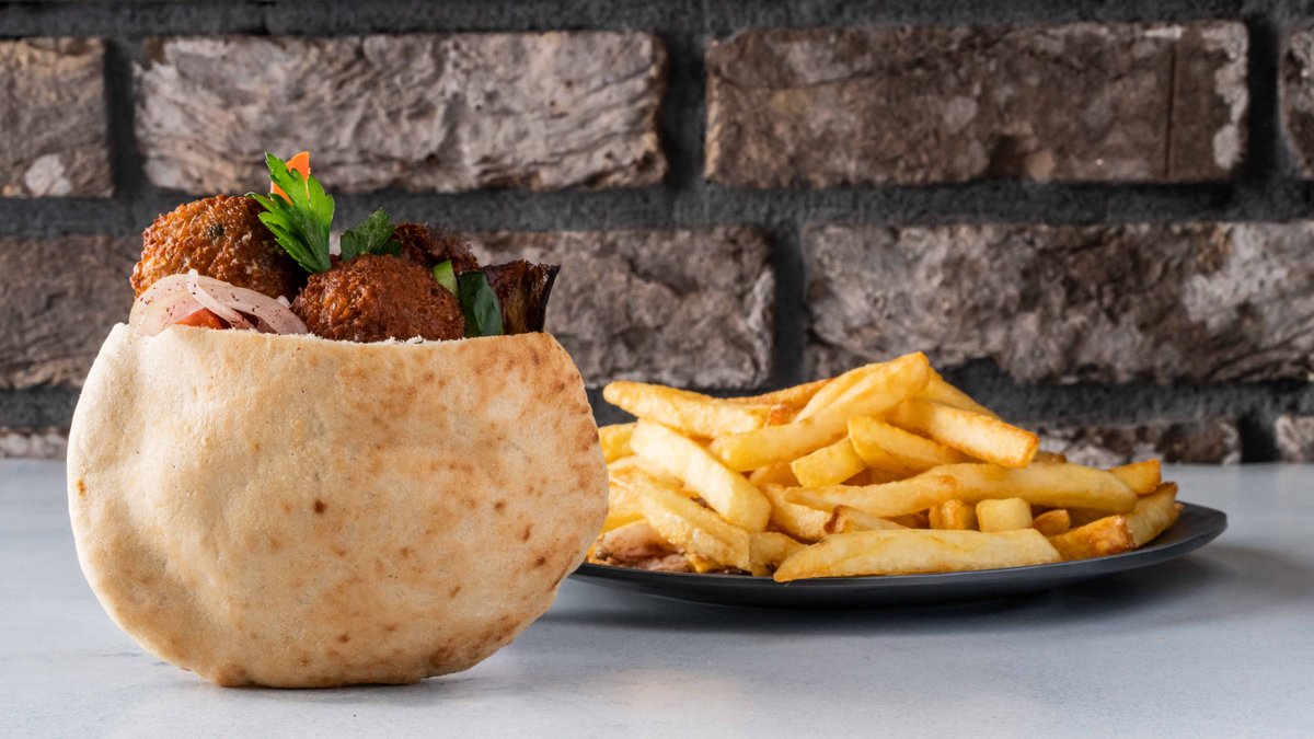 מוגש עם צ׳יפס, חמוצים וטחינה