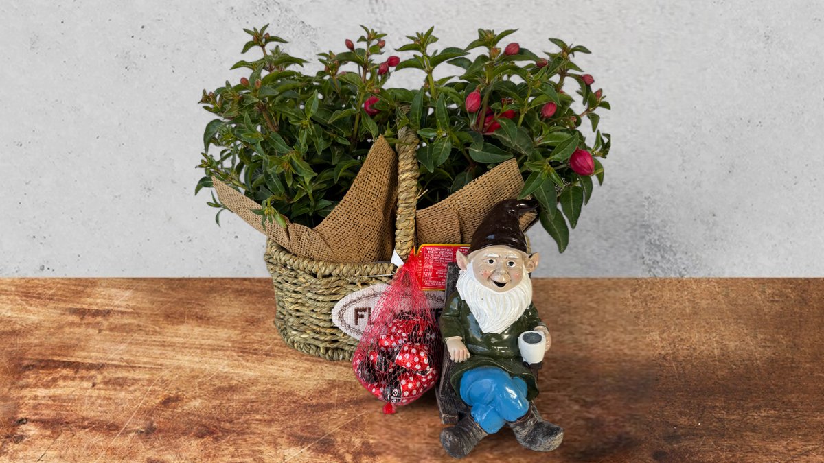 סלסלת פרחים זוגית עם גמד ומארז שוקולד