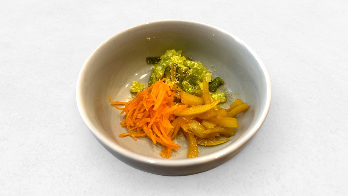 自家製のアチャールが増量になります。 キャベツのココナッツ炒め、キャロットラぺ、玉ねぎの酢漬けの三種です。