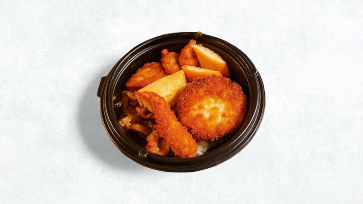 唐揚げ エビフライ、白身魚フライ、ハンバーグかメンチカツ(日による)、きんぴらごぼう、春巻き,漬物 が入った、おかずがたくさんなまかない丼です。汁もの、タルタルソース、中濃ソース、醤油 がつきます