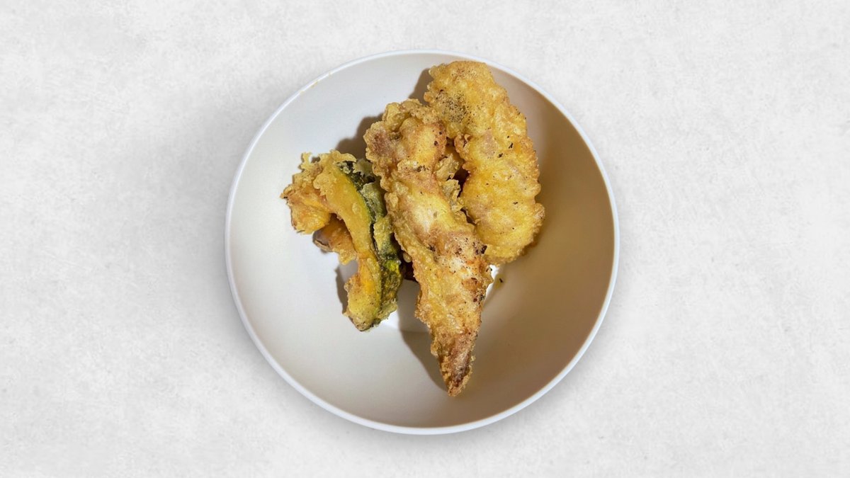 日替わり天ぷら旬の野菜を揚げたてでお届けします。天つゆ付き