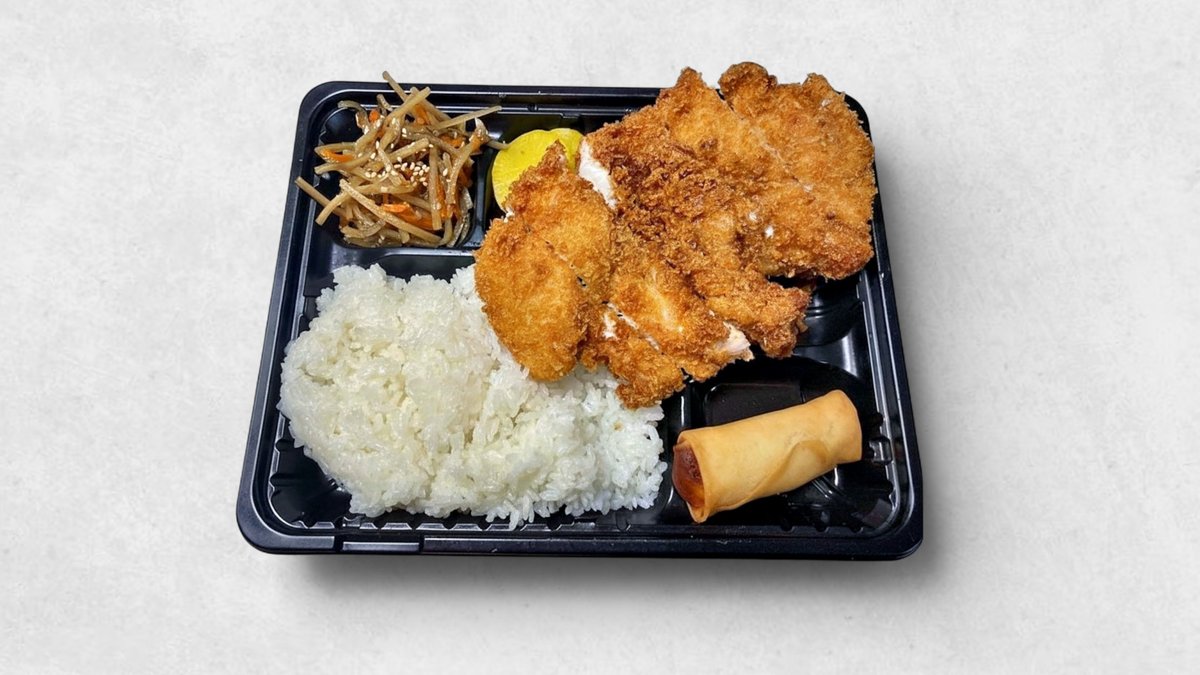 大きなチキンカツと春巻き、きんぴらごぼう、たくあん、大盛りご飯で緑が無い無作法なボリューム弁当 ソース付きご希望により醤油も付けますのでコメントください。