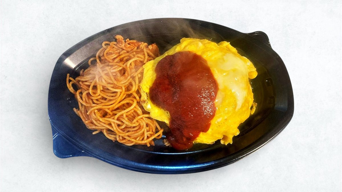 チキンライスの上に甘めの卵が乗って横にはパスタ。その上からたっぷりのハヤシライス