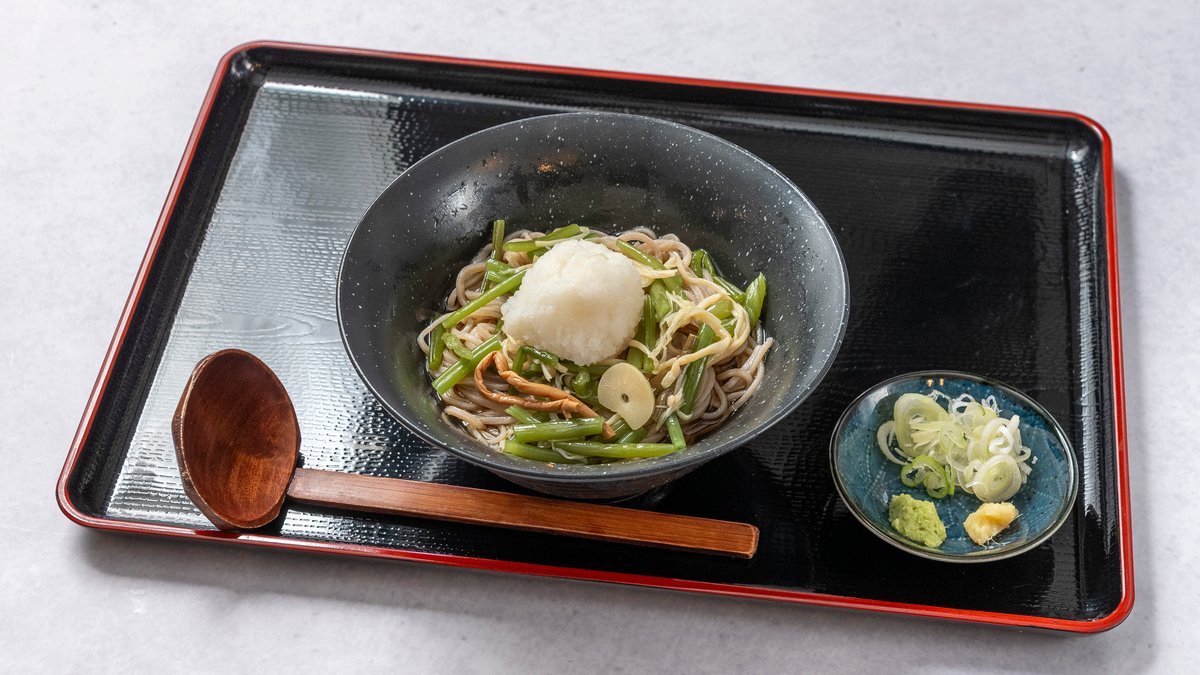 季節の山菜と大根おろしを添えたそばです。山菜の香りとシャキシャキとした食感をお楽しみください。