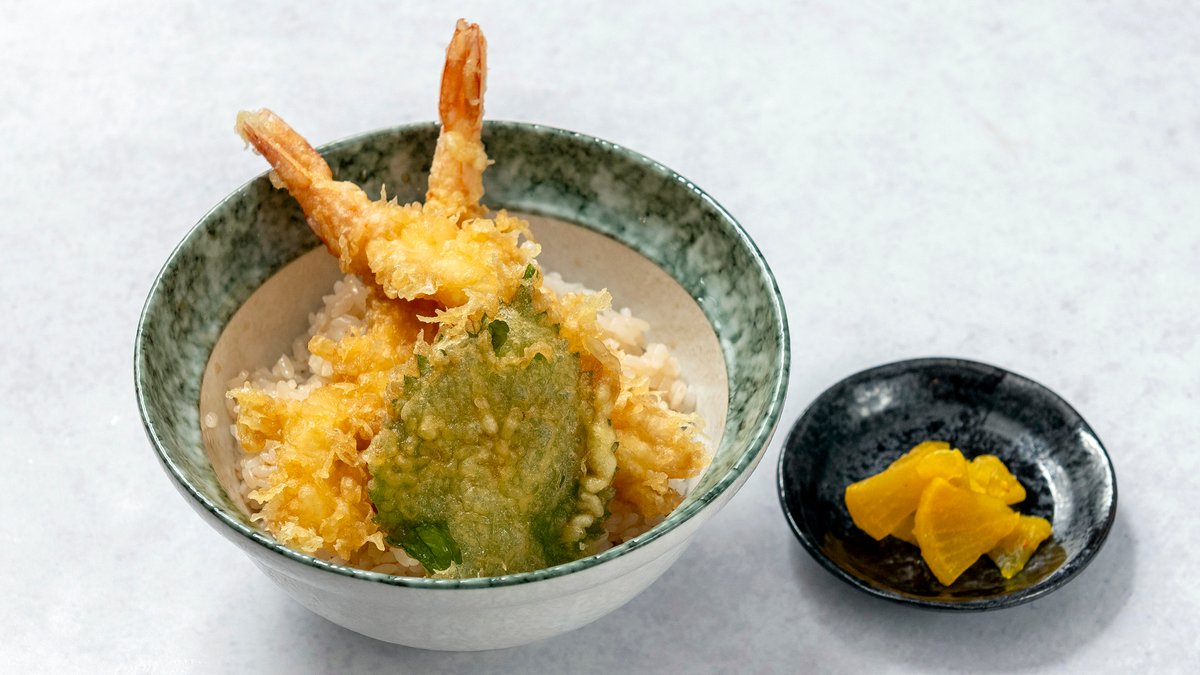 プリプリの海老をサクサクに揚げた天ぷらを、特製の甘辛いタレとご飯にのせた一品です。