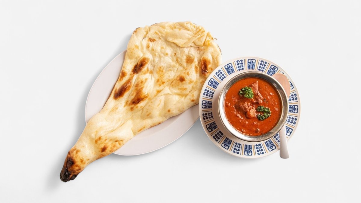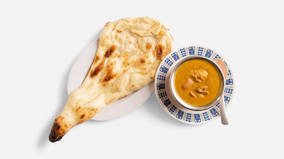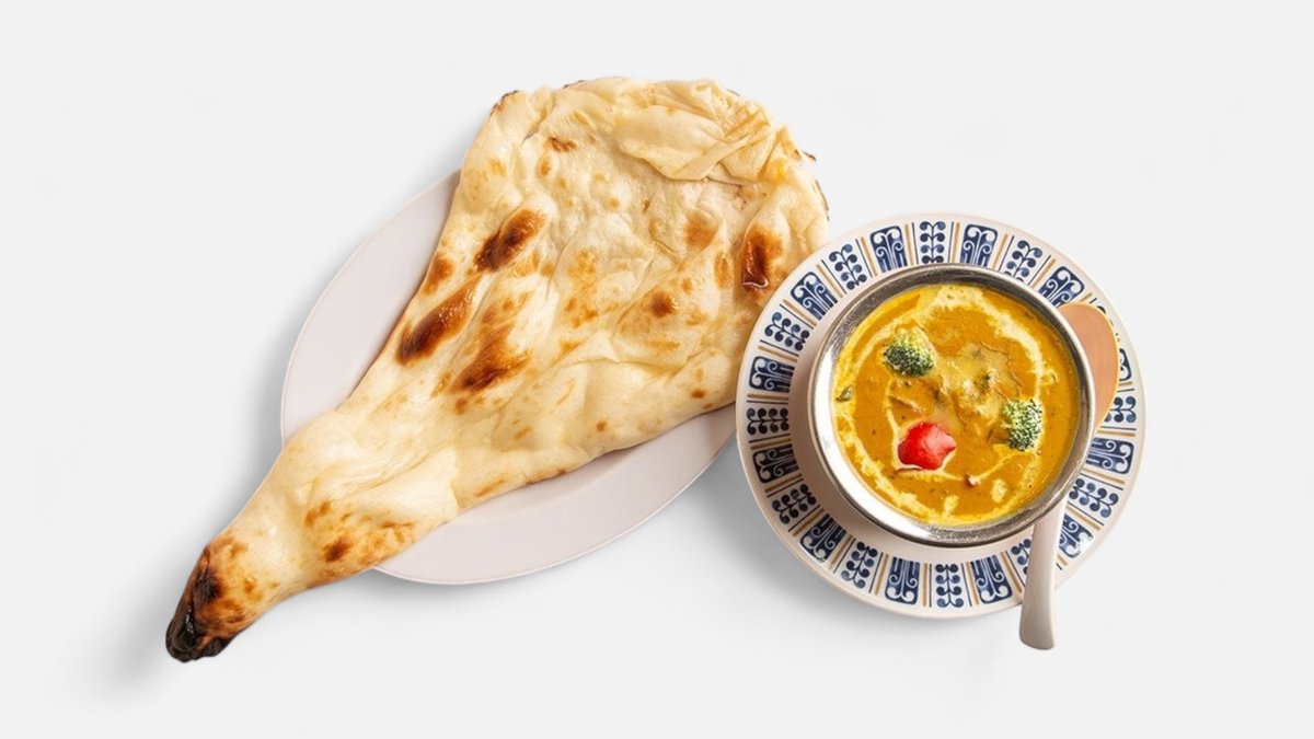 バターエビ(マイルド)・バターチキン(マイルド)・スパイシーポーク(やや辛口)・チキンココナッツミルク(マイルド)・チキンティッカマサラ(辛口)からカレーをお選びください。 ナンの種類をお選びいただけます。 (写真はプレーンナン)