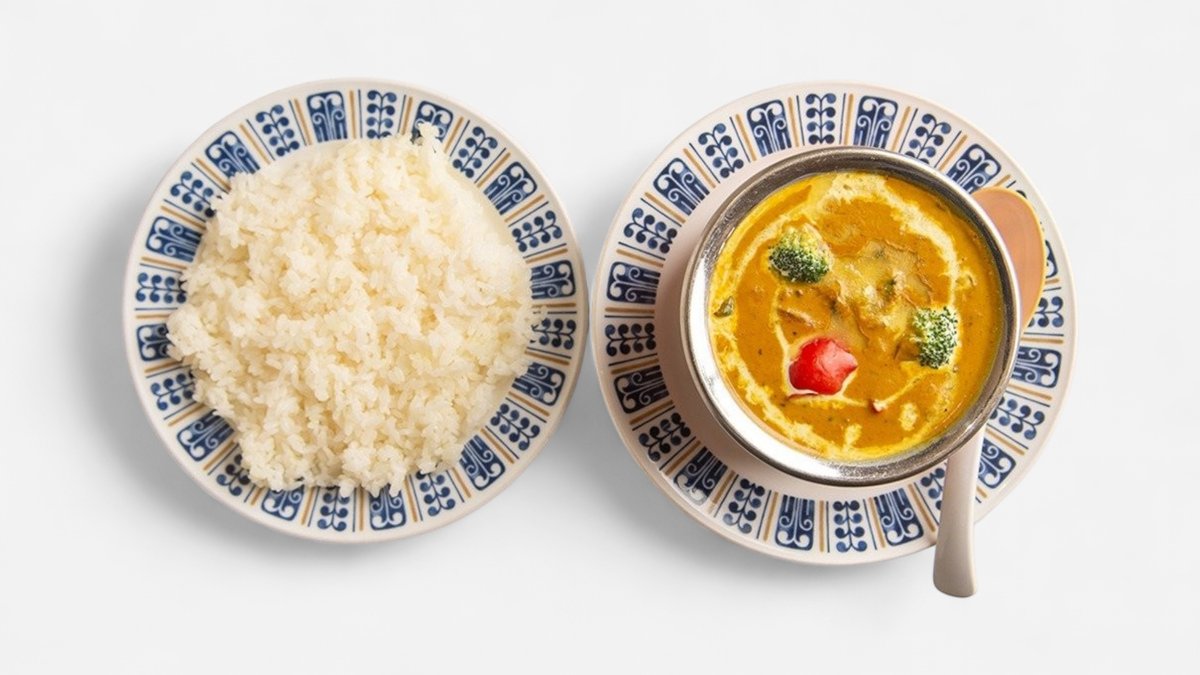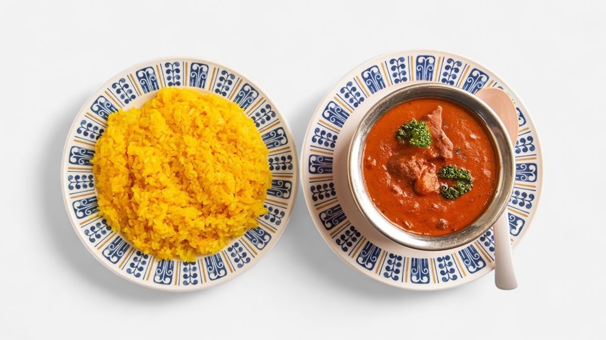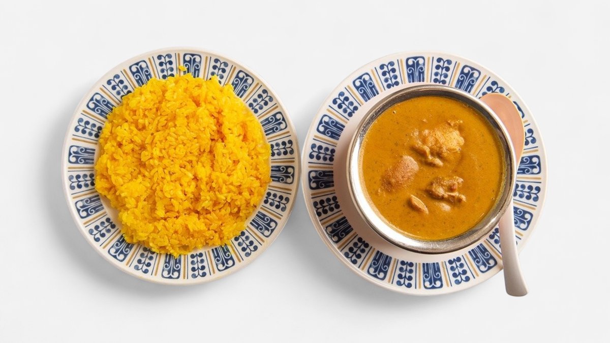 バターエビ(マイルド)・バターチキン(マイルド)・スパイシーポーク(やや辛口)・チキンココナッツミルク(マイルド)・チキンティッカマサラ(辛口)からカレーをお選びください。 ターメリックライスに変更も可能です。 (写真はターメリックライス)