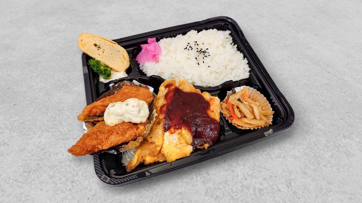 カラッと揚げた鮭フライと玉子感たっぷりのピカタが入った1度で2度美味しいお弁当です。