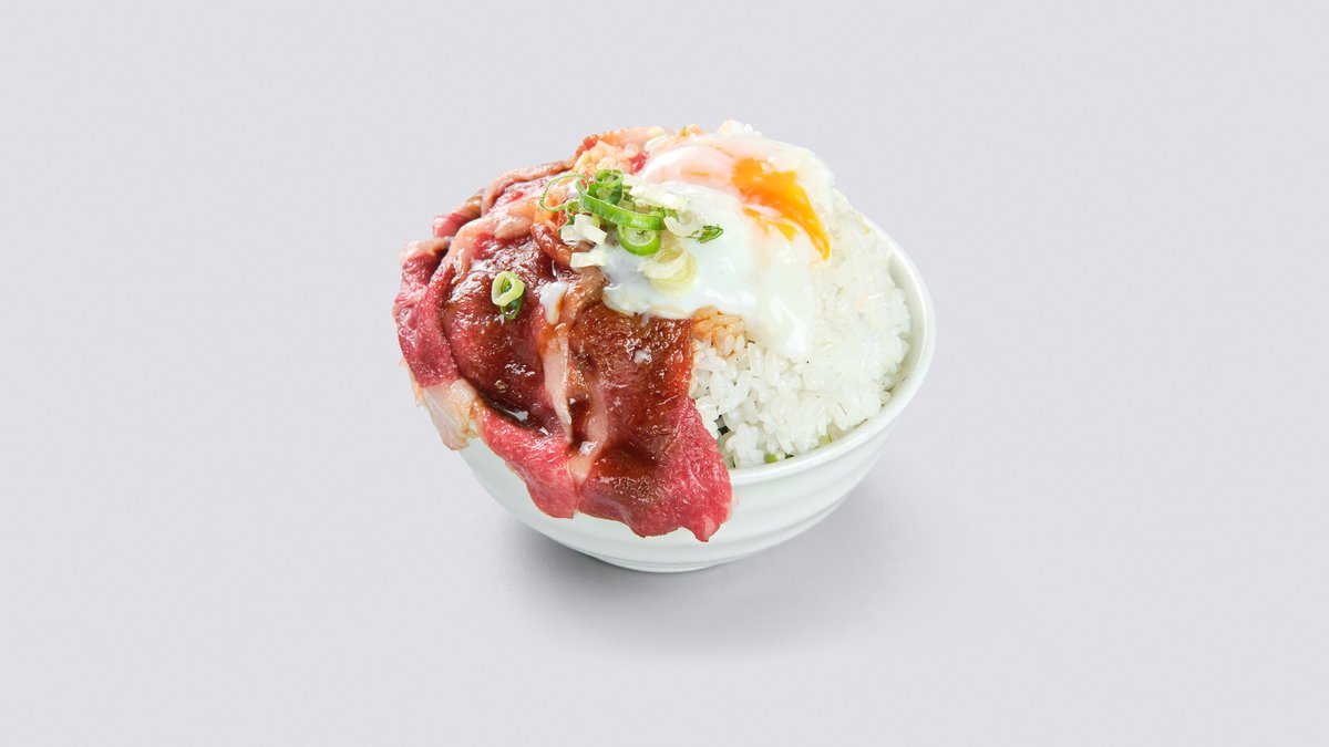 コウネと温玉を組み合わせた丼で、お肉をたっぷり200g使用しています。とろける温玉が全体をまろやかに包み込みます。