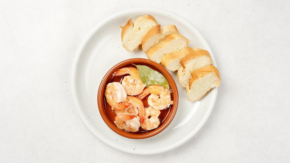 ぷりぷりのエビを、ニンニクとオリーブオイルで煮込んだ、バケットによく合う一品です。