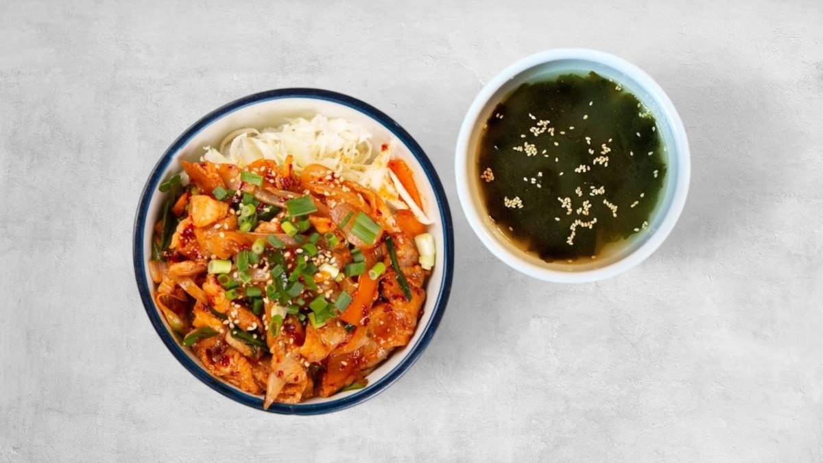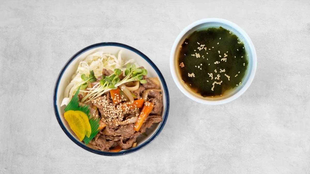 甘辛い特製ダレで炒めた牛肉をたっぷり盛り付けたプルコギ丼に、やさしい味わいのワカメスープを合わせた満足セットです。旨みが染みたプルコギと、さっぱりとしたスープの相性がよく、バランスよく食事を楽しめます。