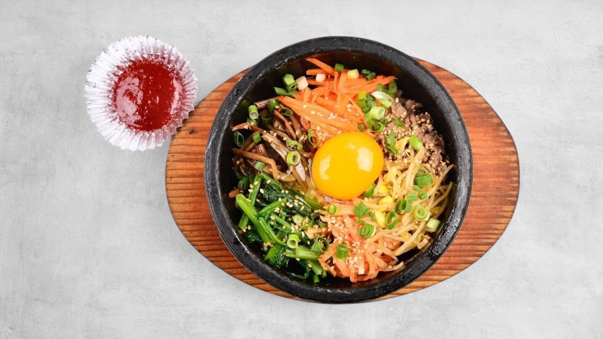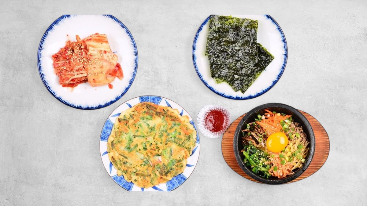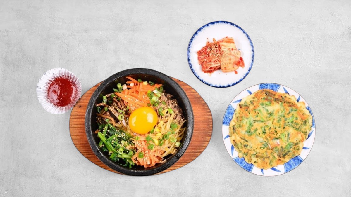 香ばしく仕上げたビビンバに、外はカリッと中はもちっとしたニラチヂミ、旨味と辛味のバランスが良い白菜キムチ、そして風味豊かな韓国のりを組み合わせた満足セットです。味・香り・食感のバリエーションが豊かで、一度に韓国料理の定番をしっかり堪能できます。