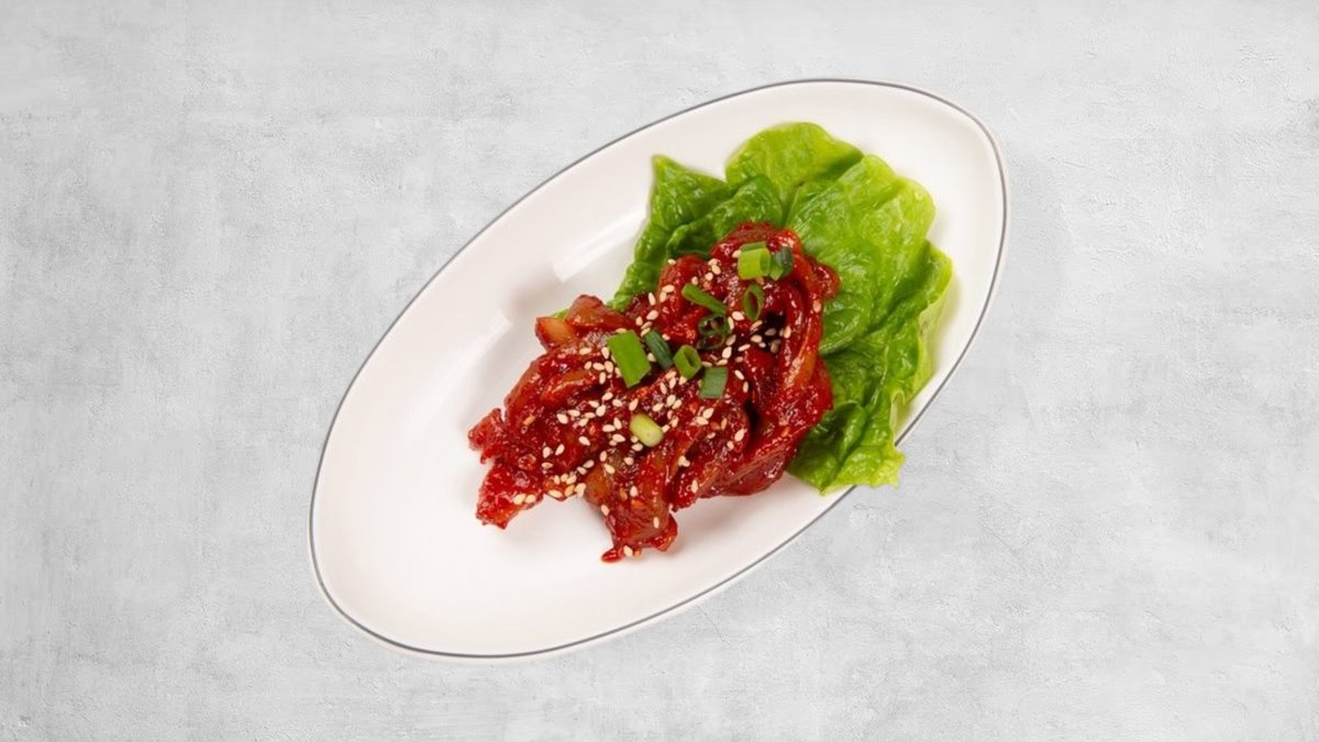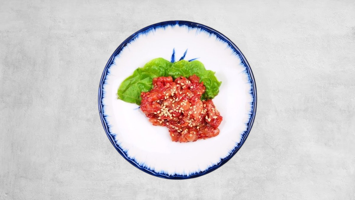 ぷりぷりの食感、ニンニクがきいた甘辛いイカキムチです。 ご飯にもつまみにもぴったり!
