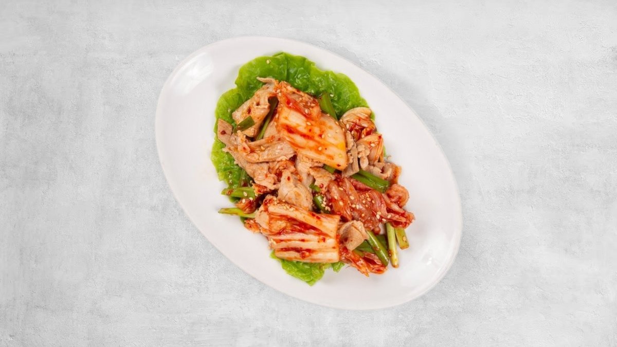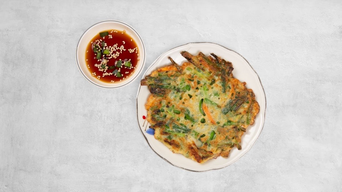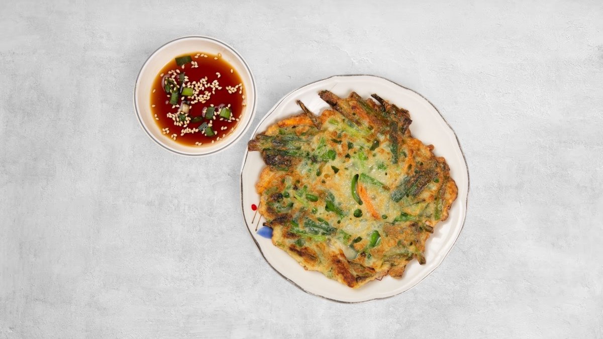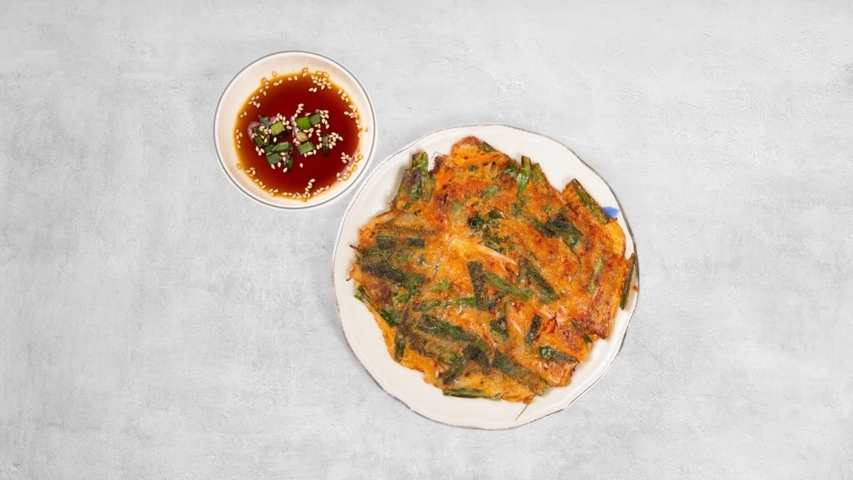 にらチヂミがベースでキムチが入ったチヂミです。キムチの旨みと辛味を活かした満足感のあるチヂミです。