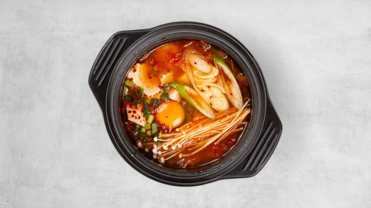熱々の石鍋でグツグツ煮えたスンドゥブチゲは、香ばしい唐辛子の風味と深みのある旨辛スープがクセになる一品。ふんわり豆腐、たっぷりの野菜、ピリ辛の調味が絶妙に溶け合い、ひと口ごとに身体の芯から温まります。