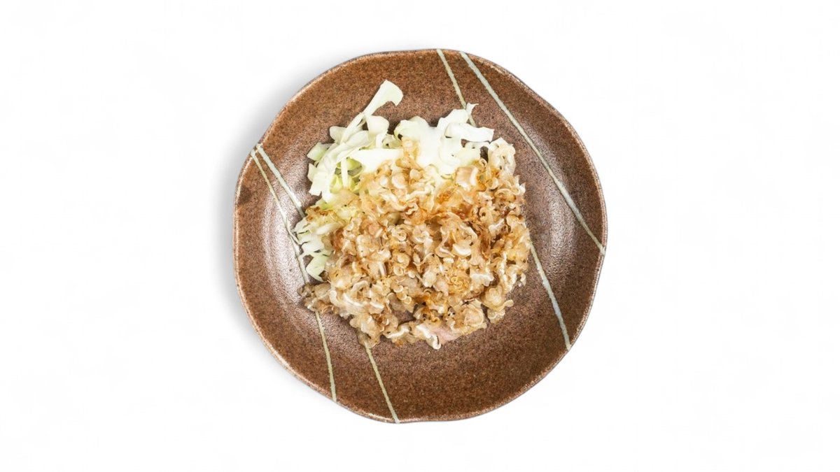 野菜のみのシンプルなお好み焼きです。 タップで *トッピングを追加できます。