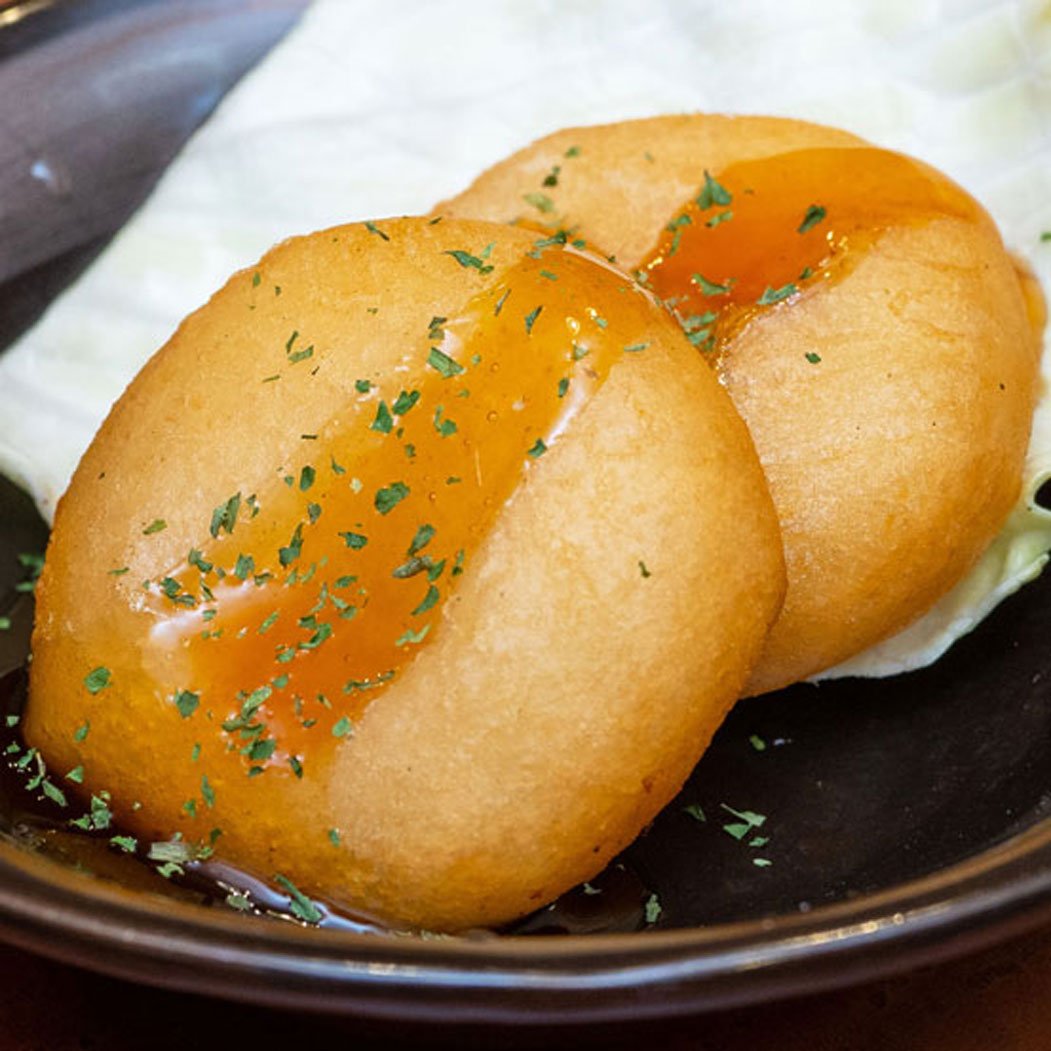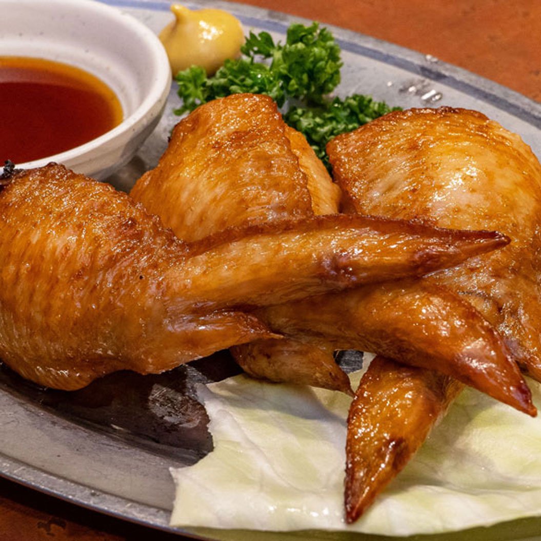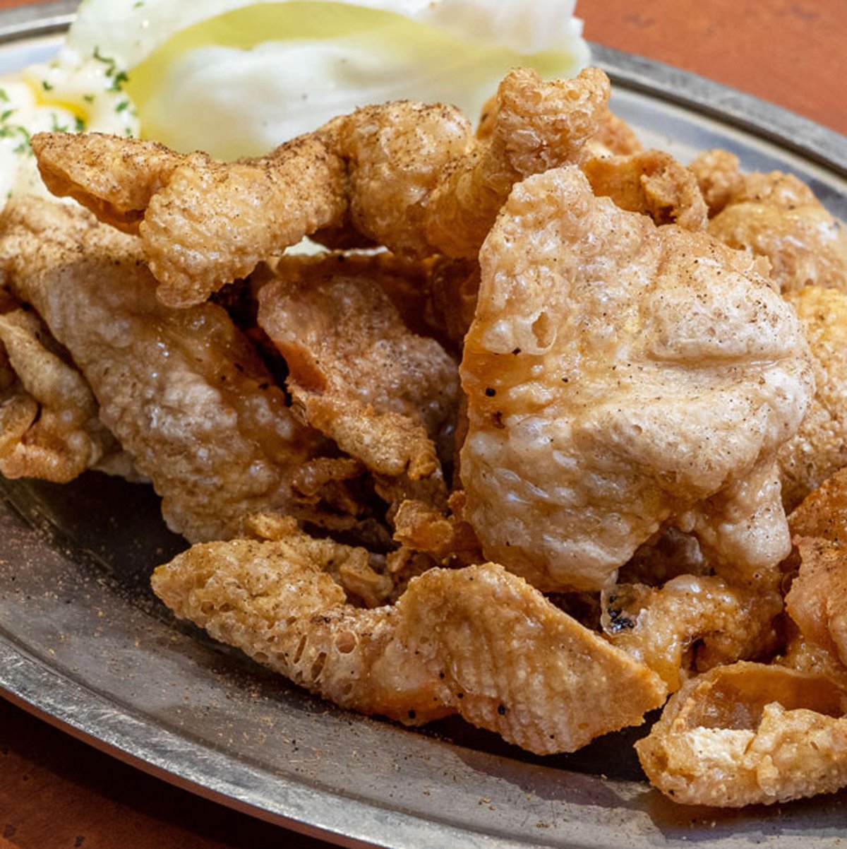 番長秘伝のタレにくぐらせた後にオリジナルスパイスを振りました! サクモチジュワァな食感! 居酒屋時間帯で食べれる揚げ皮串になります。