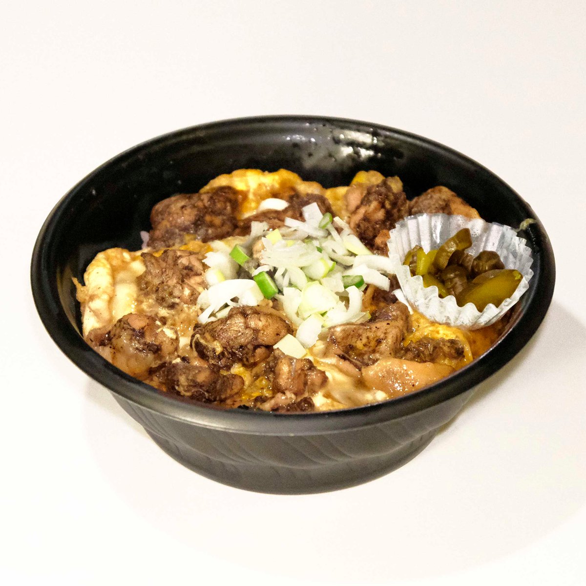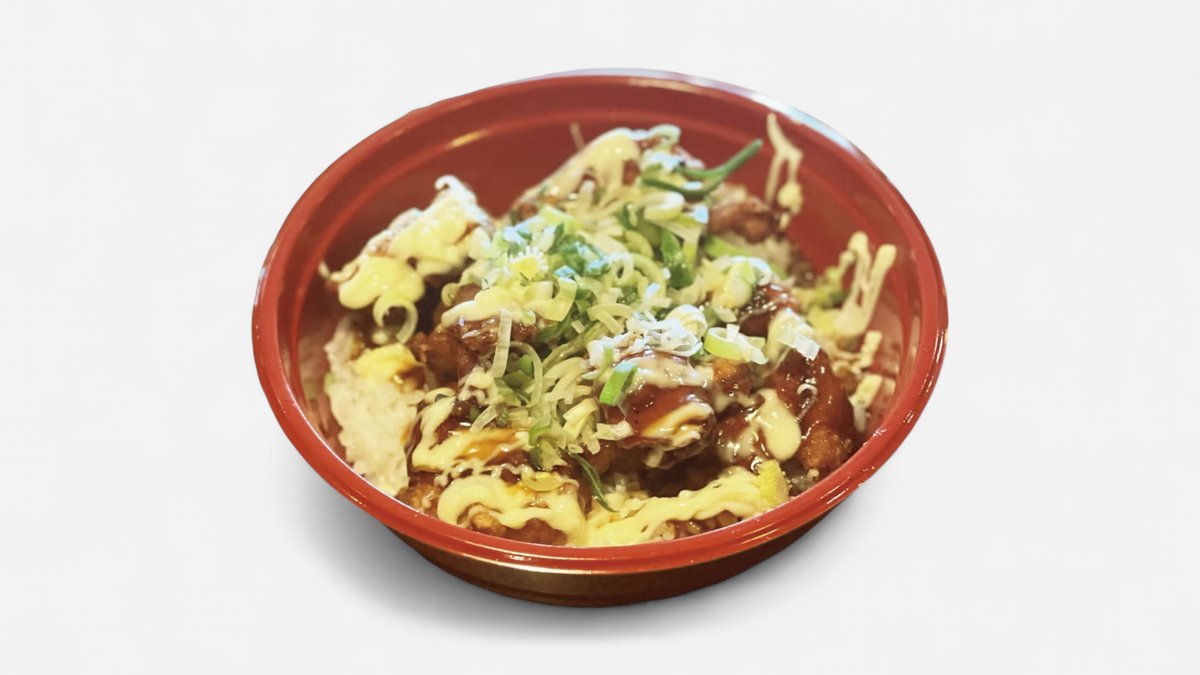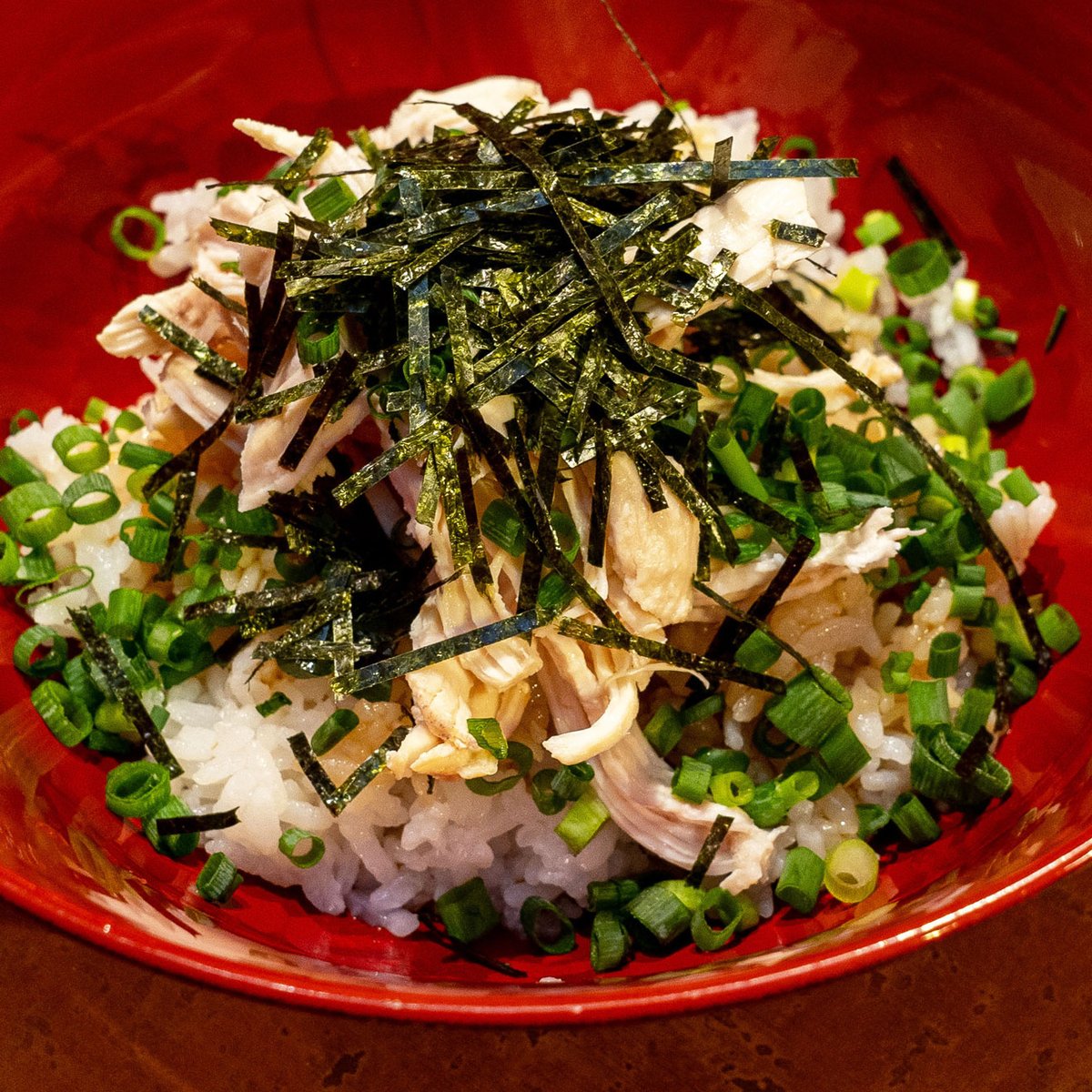 ご飯に番長特製タレ、蒸し鶏、ネギ、刻みのりかかっていて、よくまぜて食べてね!